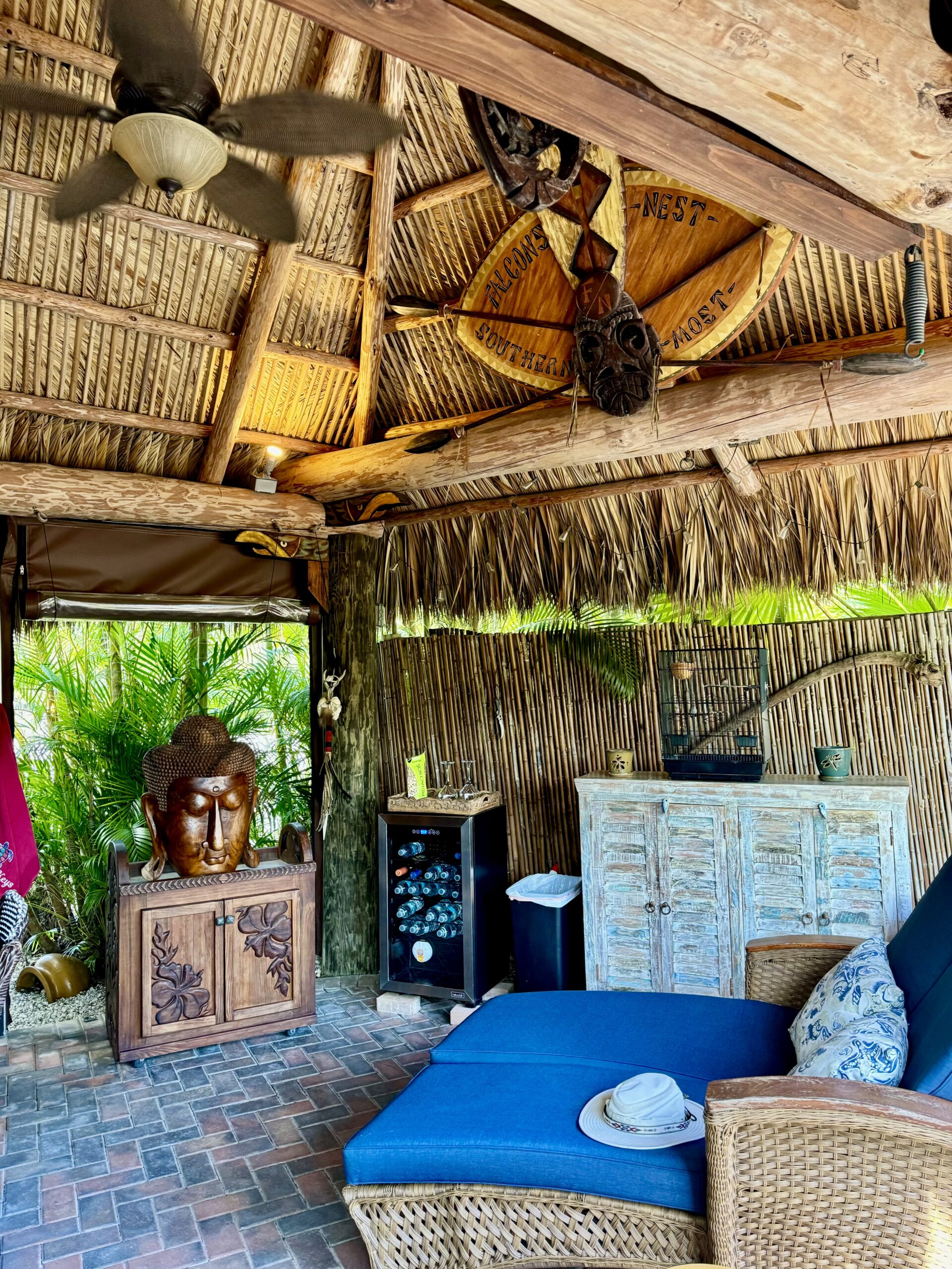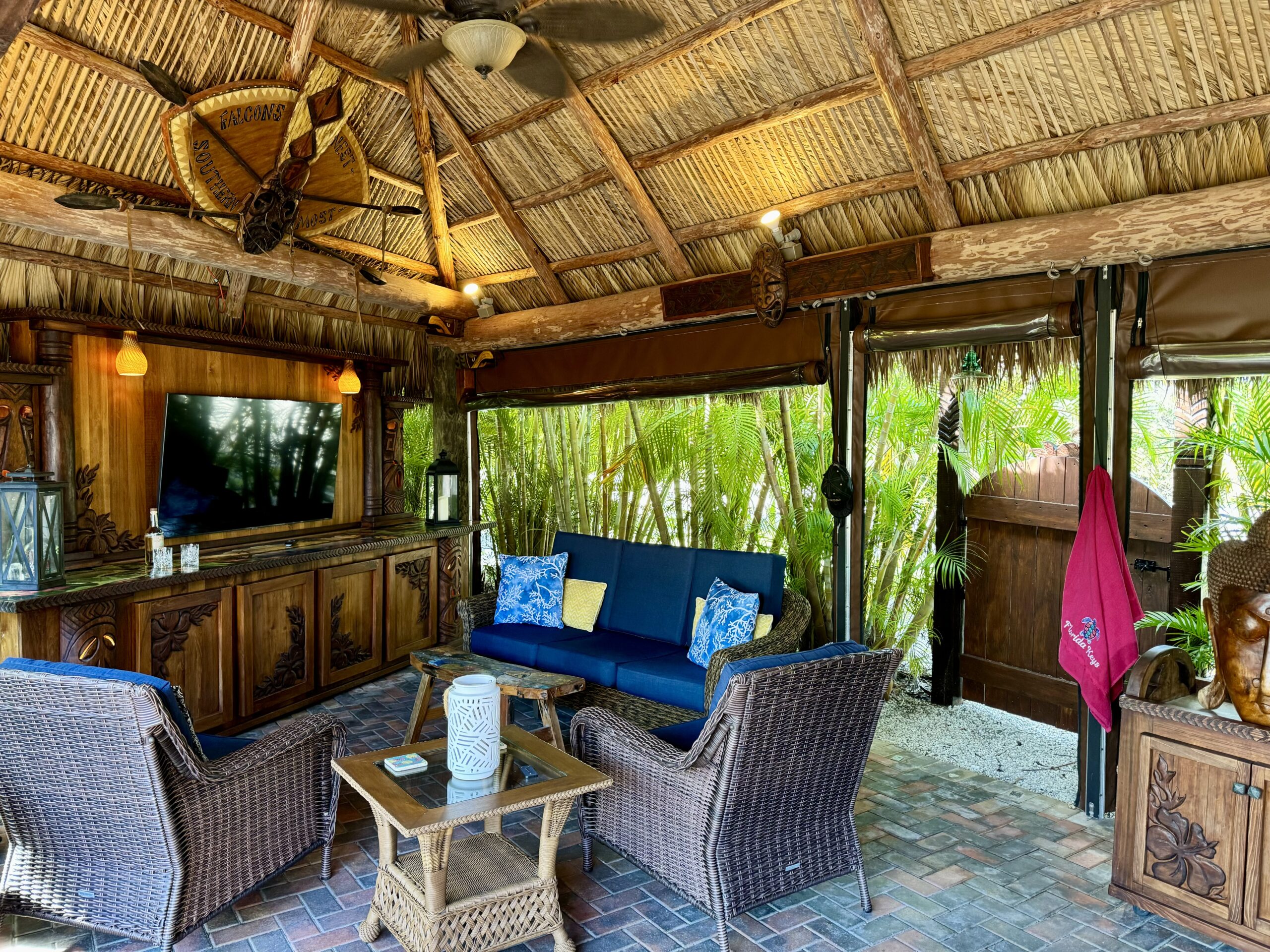Step into your own private oasis, complete with a spacious paved patio dining area and a fully furnished tiki hut—ideal for relaxing, entertaining, or simply soaking in island vibes.