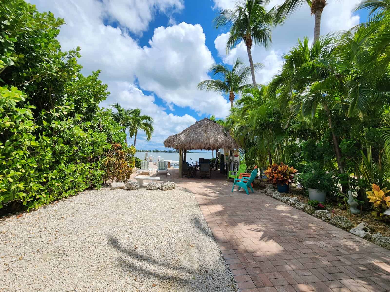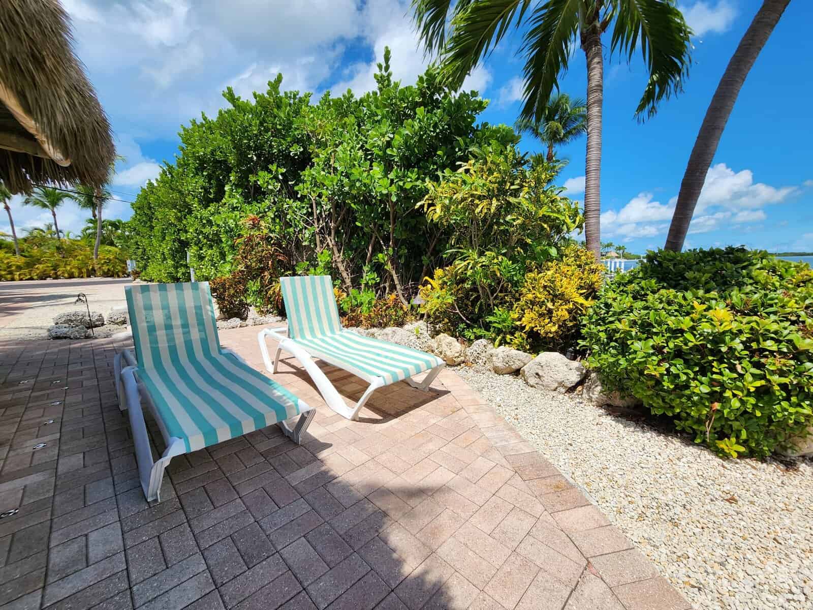 We have extensive gardens and beautiful lighting along the path. Lush landscaping makes this lot very private. There is plenty of room for a big rig, and your car and the pavers are comfortable walking on. The permanent dock is lit and has an underwater light that comes on at dusk. Just wait until you see all the fish!! Most are Mangrove Snappers. Be sure to share your leftovers with them! Swim ladder on the dock. You can walk down the stone steps into the water with your beach chair, it’s a great place to sit in the sun and stay cool with your feet in the water. The large palm trees and tropical plants provide shade for relaxing out of the sun.