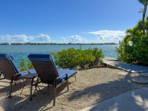Relax beneath the cozy tiki hut, now enhanced with sliding glass doors on two of the three open sides, creating a wind-protected retreat from the bay while still preserving your beautiful water views. The third side features an extended thatched roof, providing additional rain coverage so you can enjoy the space comfortably in nearly any weather. The shaded area includes comfortable seating and a dining table, making it the perfect setting for outdoor meals, morning coffee, or sunset happy hours.