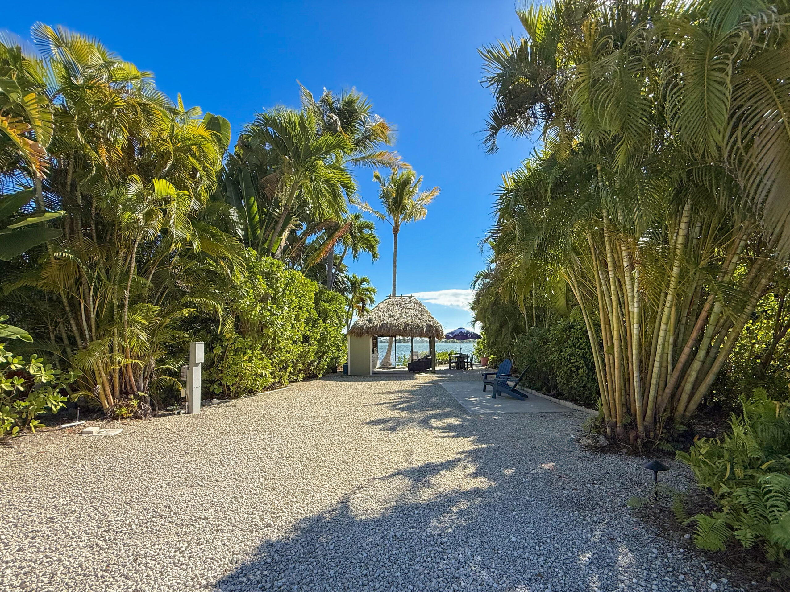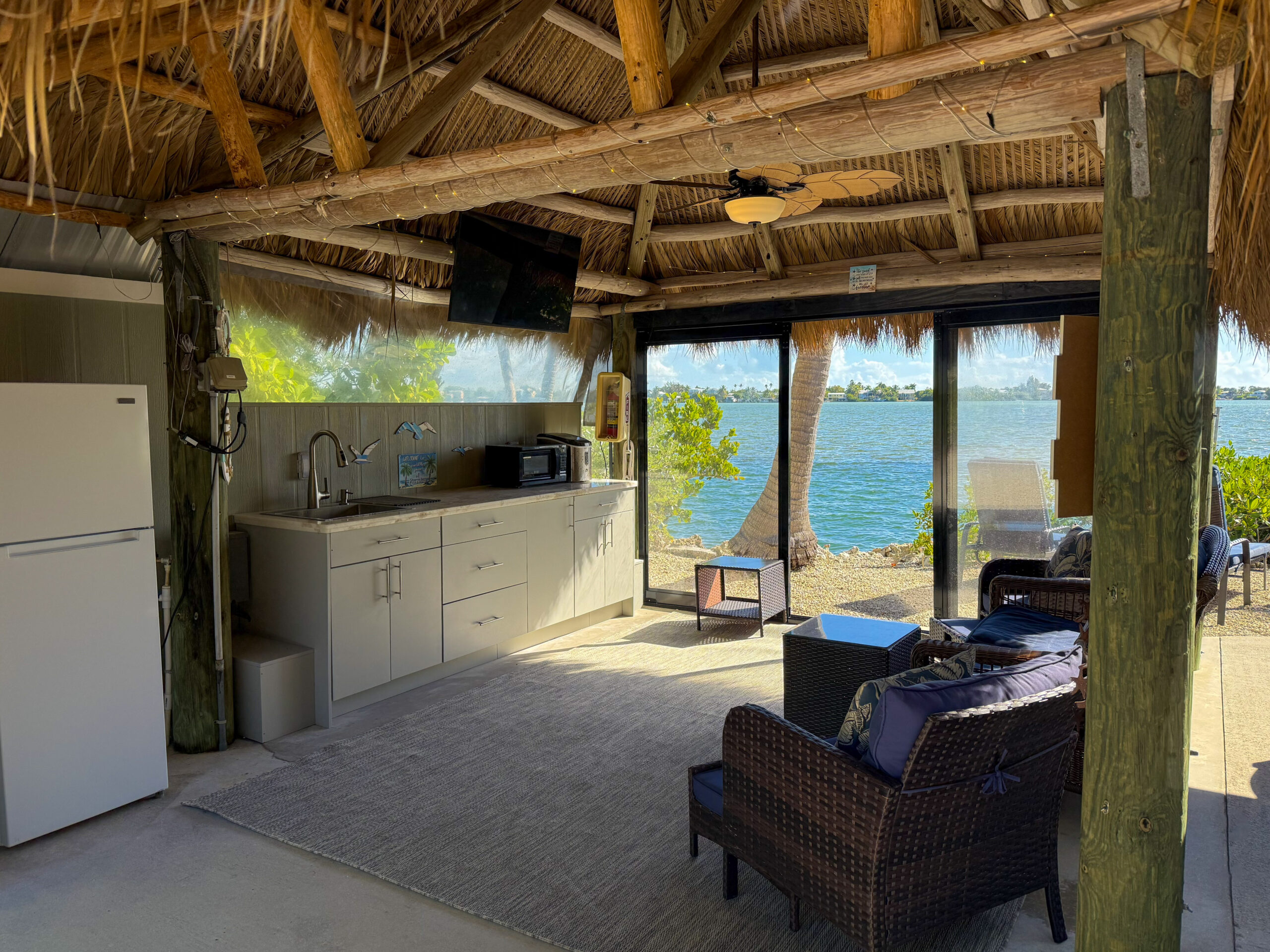 Relax beneath the cozy tiki hut, now enhanced with sliding glass doors on two of the three open sides, creating a wind-protected retreat from the bay while still preserving your beautiful water views. The third side features an extended thatched roof, providing additional rain coverage so you can enjoy the space comfortably in nearly any weather. The shaded area includes comfortable seating and a dining table, making it the perfect setting for outdoor meals, morning coffee, or sunset happy hours.